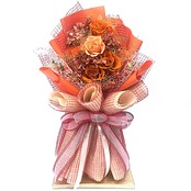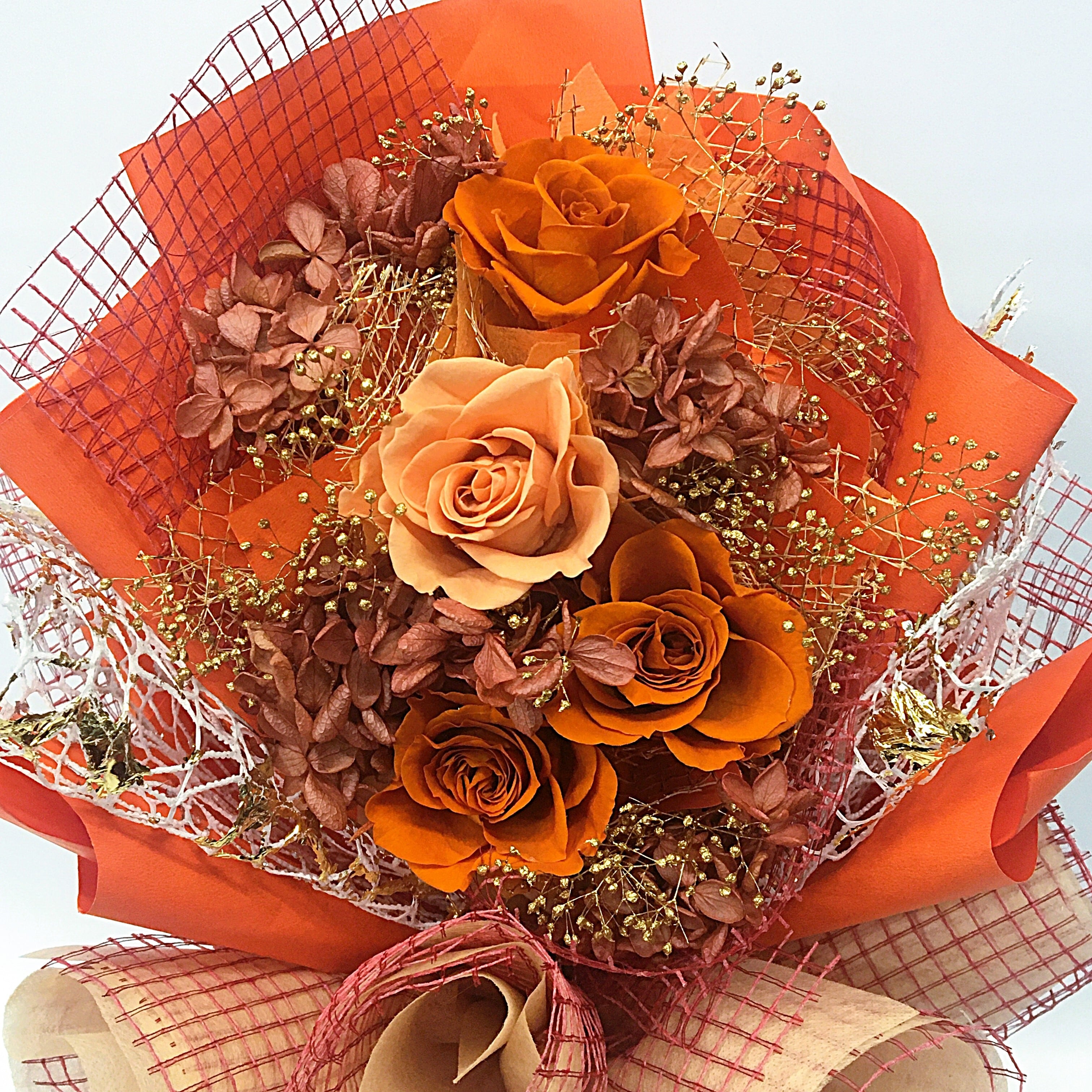 ブーケ風アレンジメント(オレンジ)A-034は、当店人気アイテム『置けるブーケ』をそのままアレンジメントタイプにデザインした特別なフラワーギフトです。まるで手に取ったかのようなブーケの可愛さと、アレンジメントのゴージャス感が絶妙に融合し、見る人の心を惹きつける美しいデザインとなっています。お部屋のインテリアとしてはもちろん、大切な方への贈り物にも最適です。