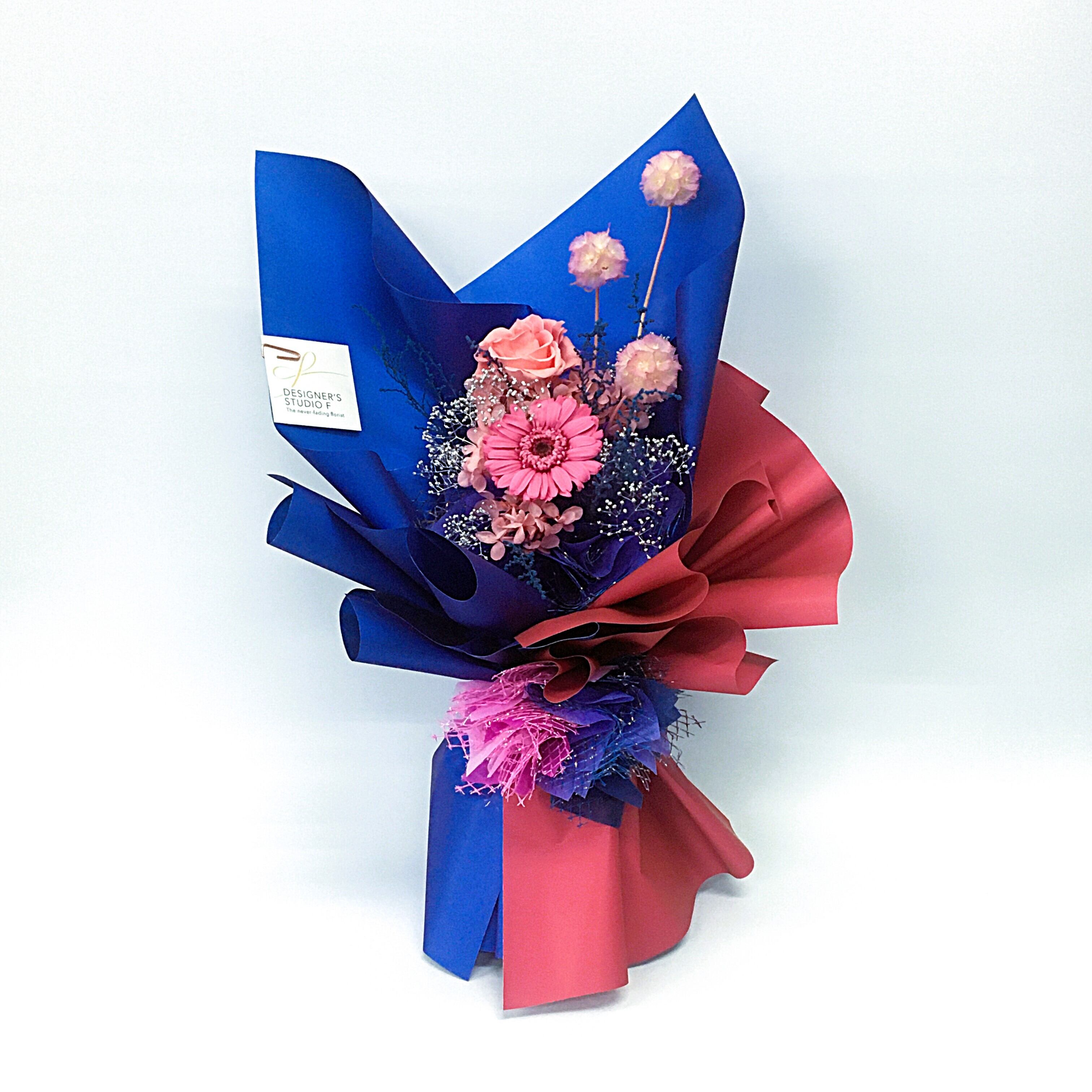 置けるブーケ(ブルー×パープル)B-043は、洗練された大人の雰囲気を持つ特別なブーケです。クールな色合いと個性的な素材が印象的で、おしゃれなプレゼント、その後はインテリアとしてご利用頂けます。男性が持っても映えるこのブーケは、シーンを選ばず、特別なプレゼントとして受け取られた方の心に残るフラワーギフトとなります。