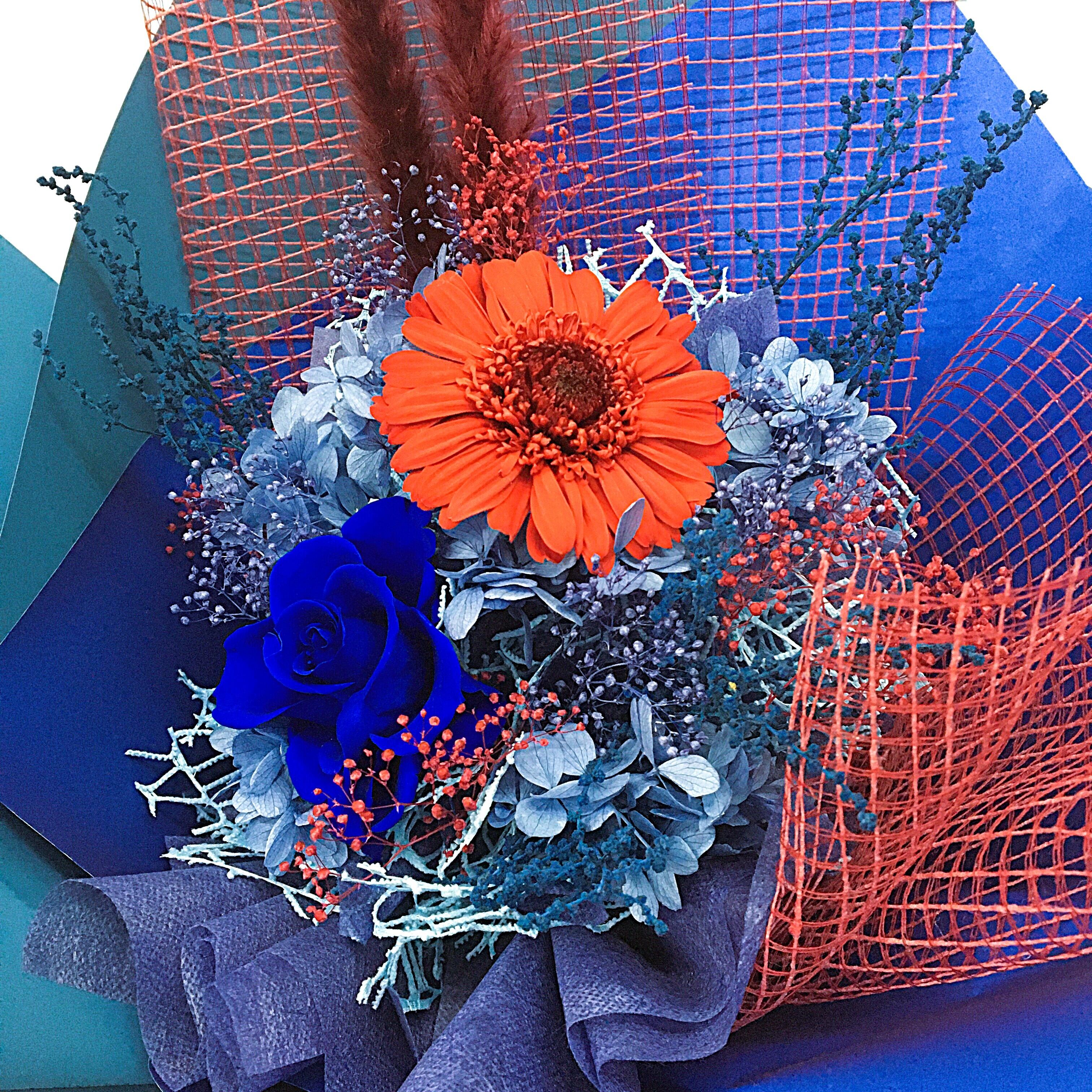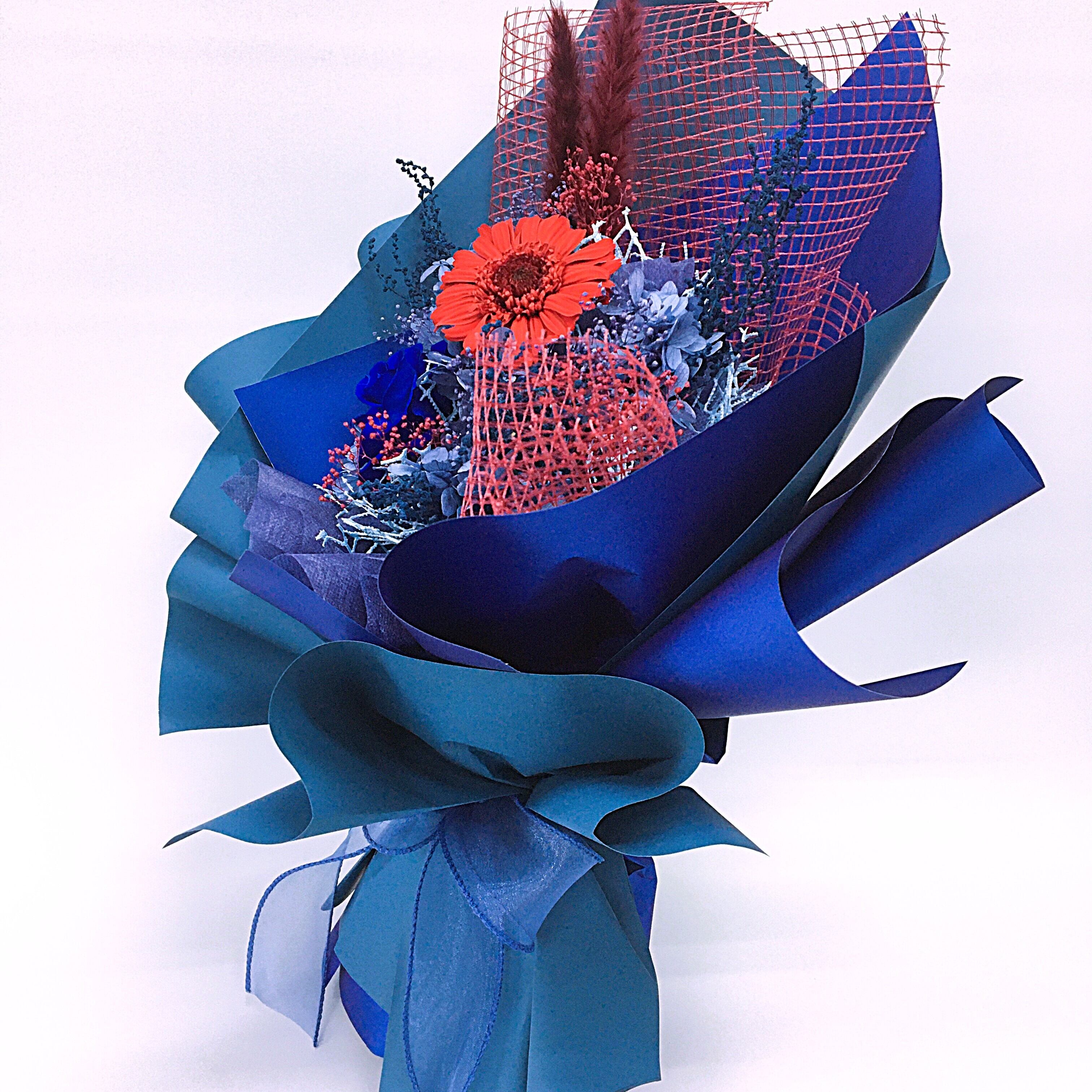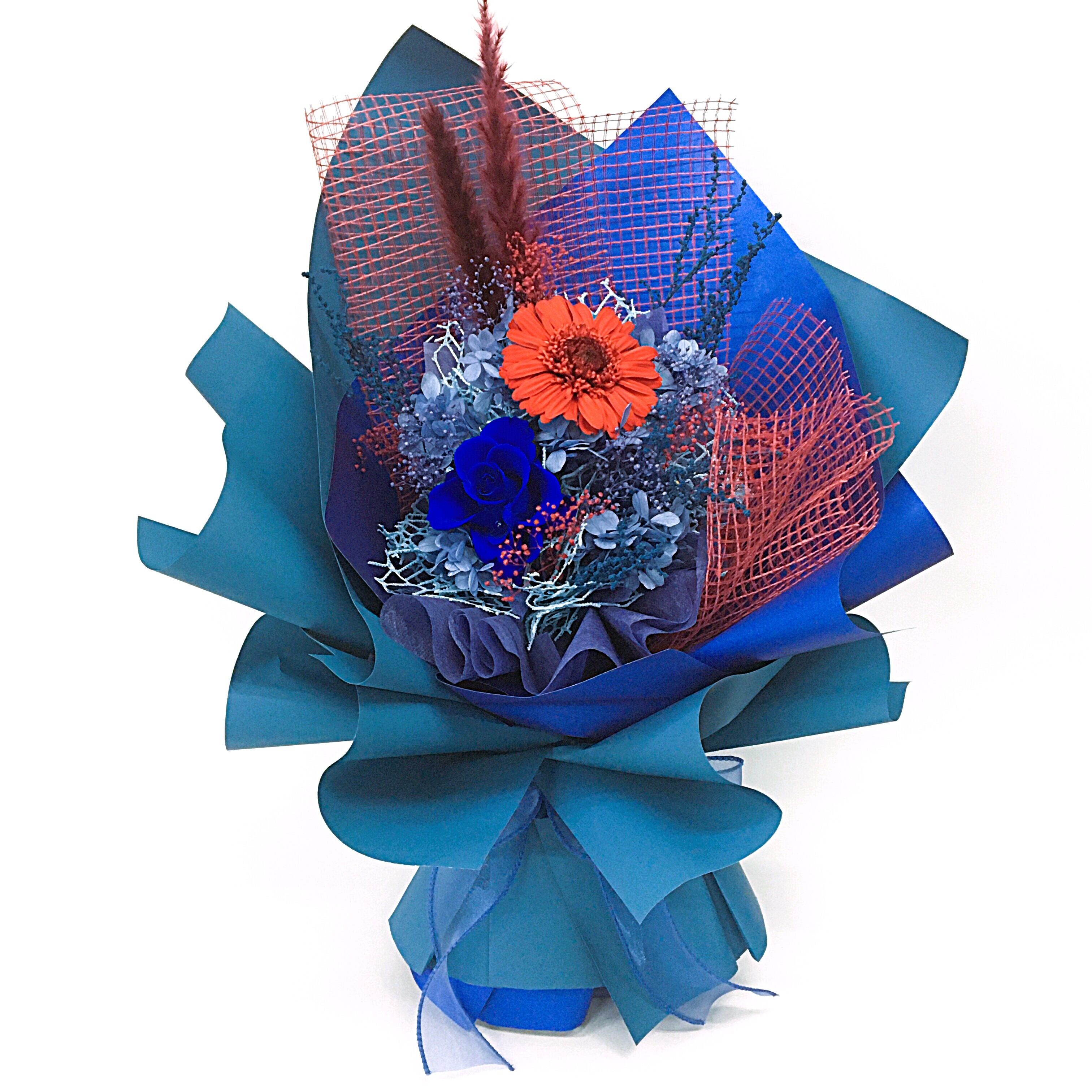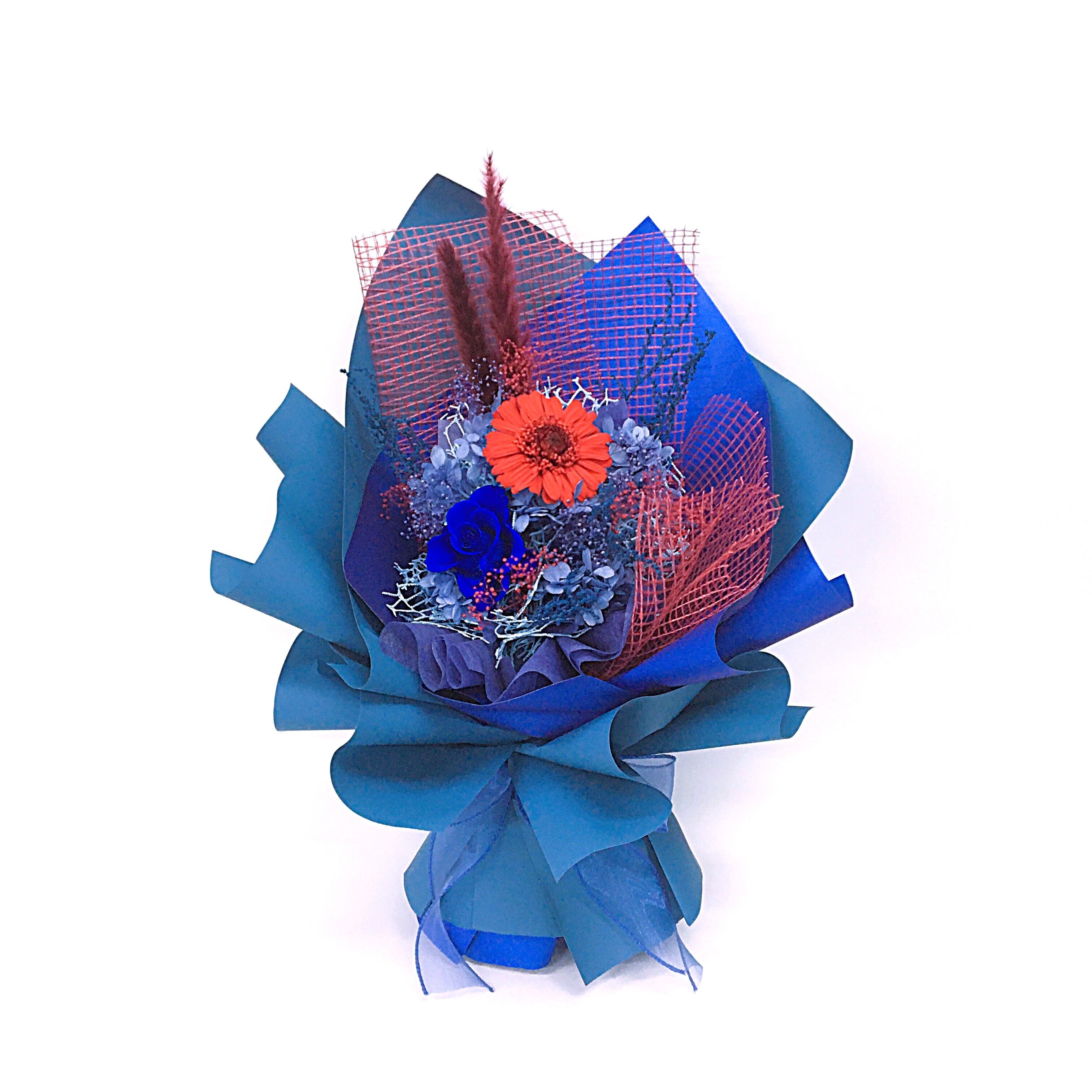 置けるブーケ(ブルー×レッド)B-046は、スタイリッシュなデザインが際立つフラワーギフトです。クールなブルーと華やかな赤の組み合わせが、どんな空間にも洗練されたおしゃれを演出し、贈り物としてはもちろん、自宅のインテリアにもピッタリのアイテムです。