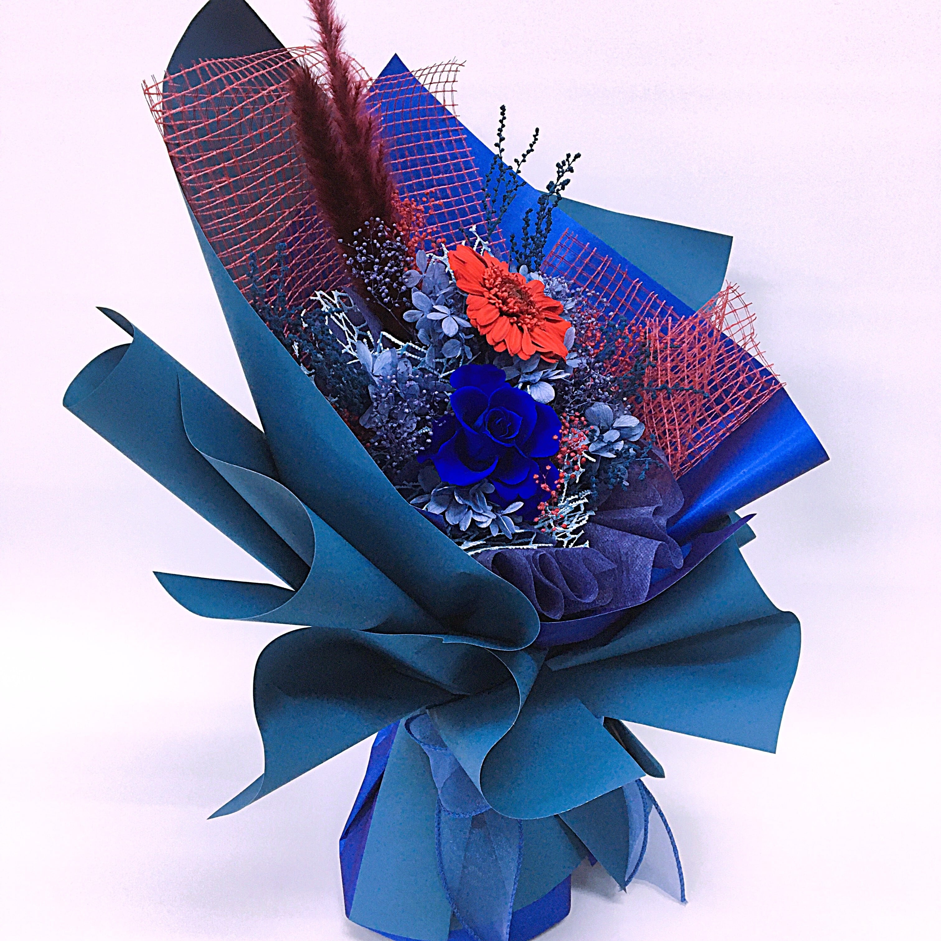 クールなブルーとビビッドな赤が魅力の置けるブーケ(ブルー×レッド)B-046
