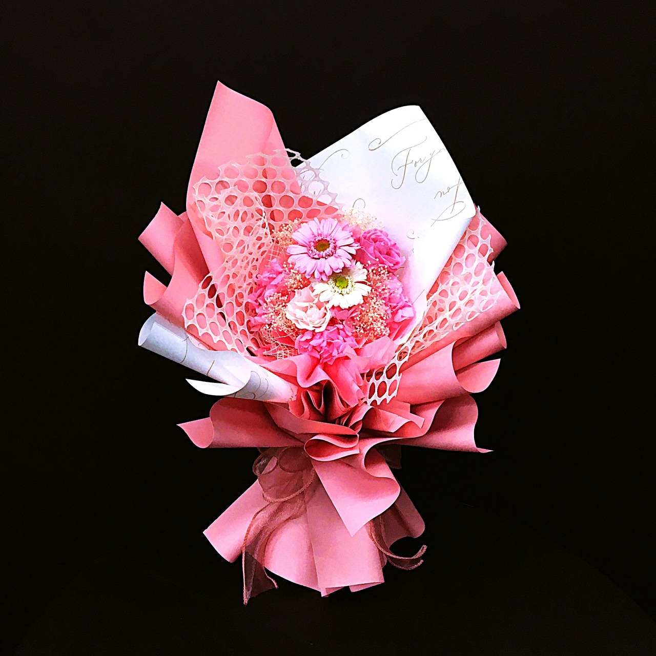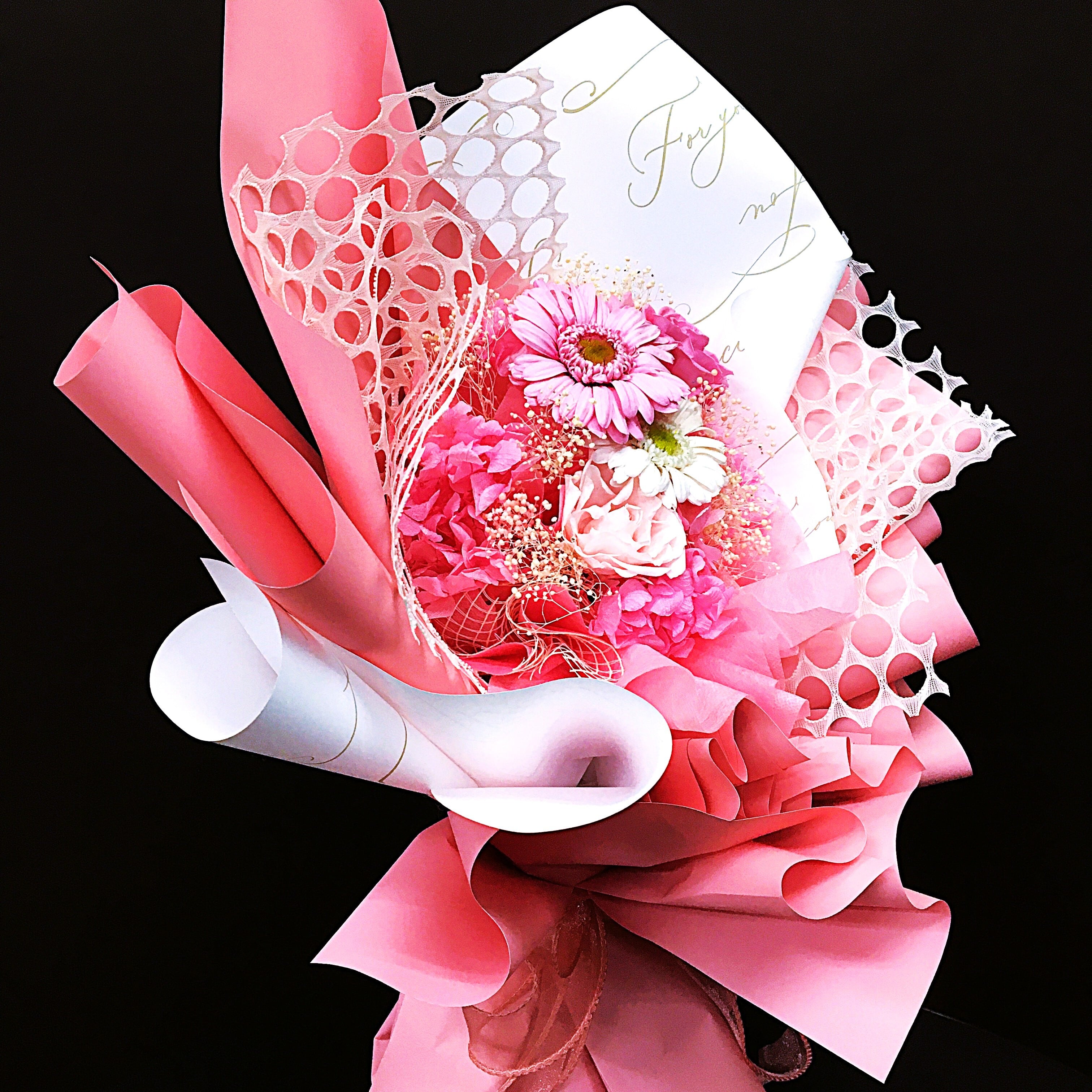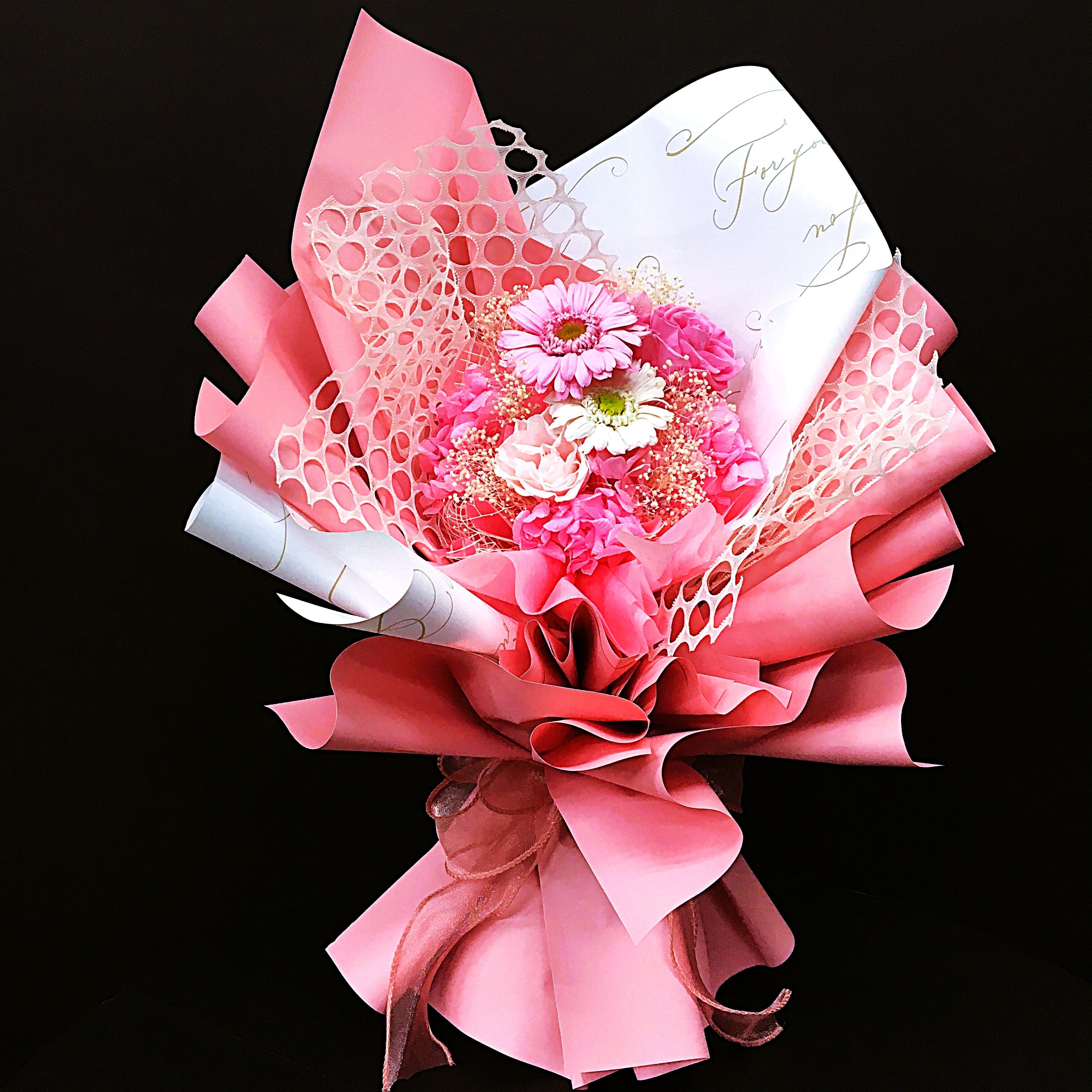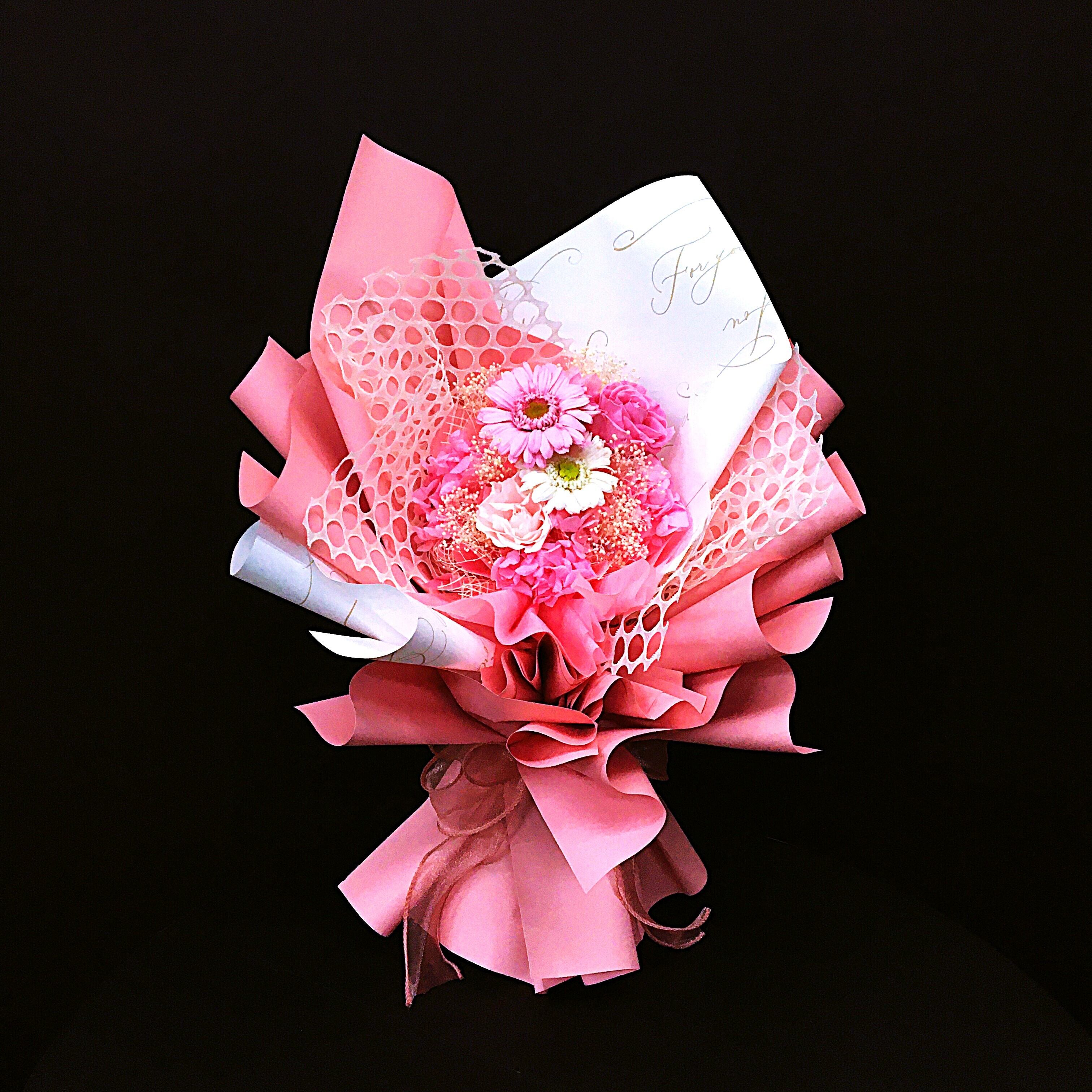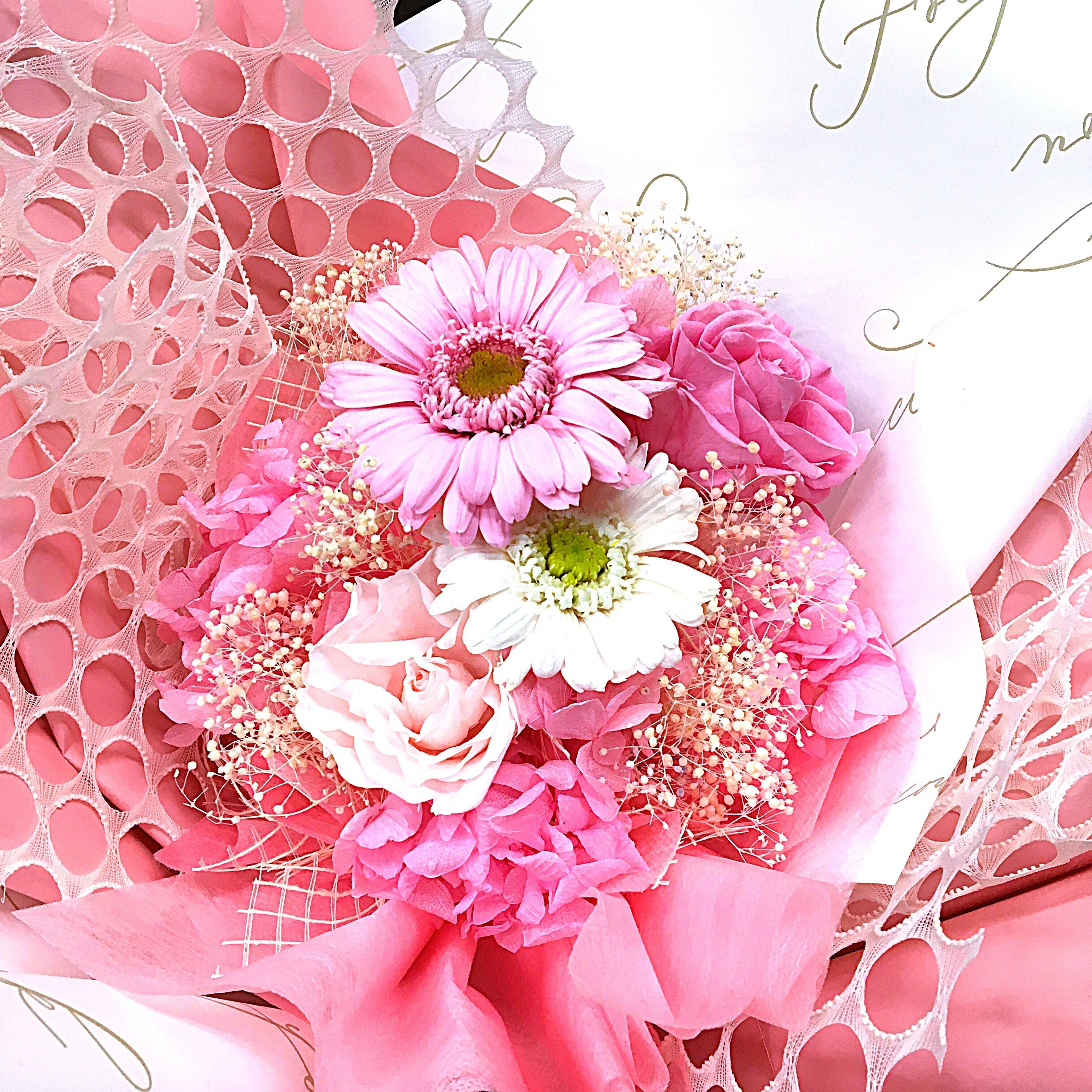 ・可愛いピンクの花とクリーンなホワイトが絶妙に調和し、華やかで可愛らしさを演出致します。