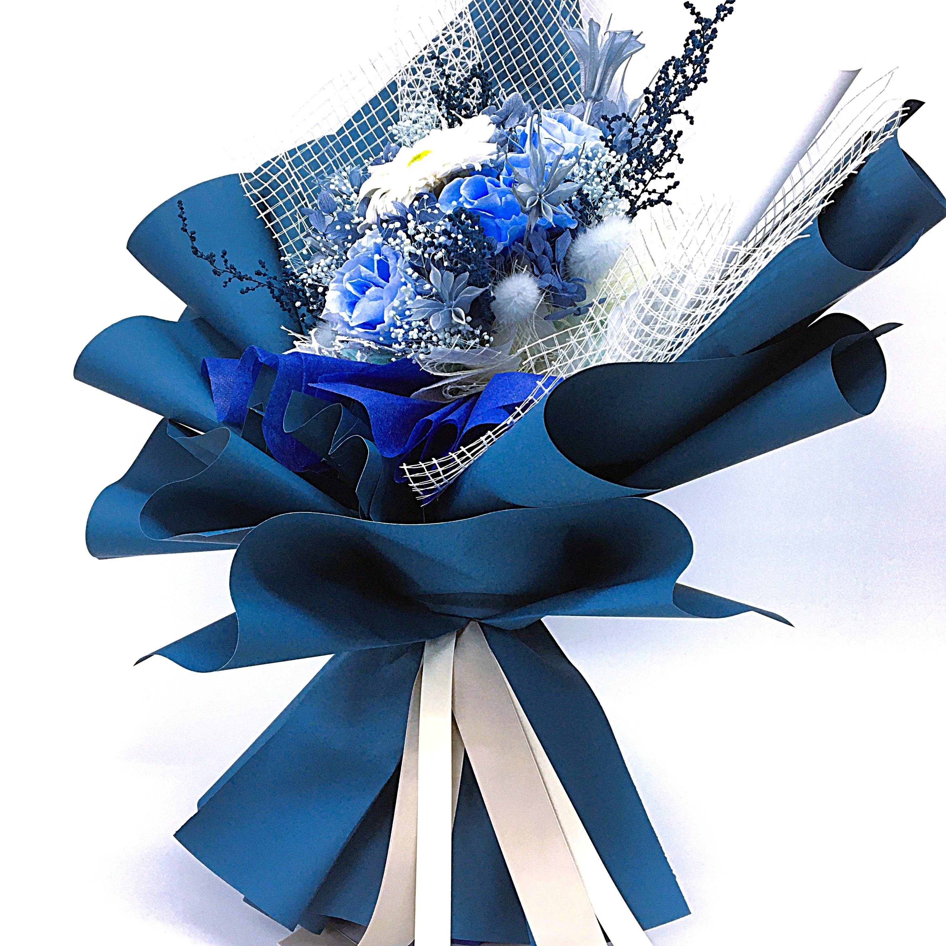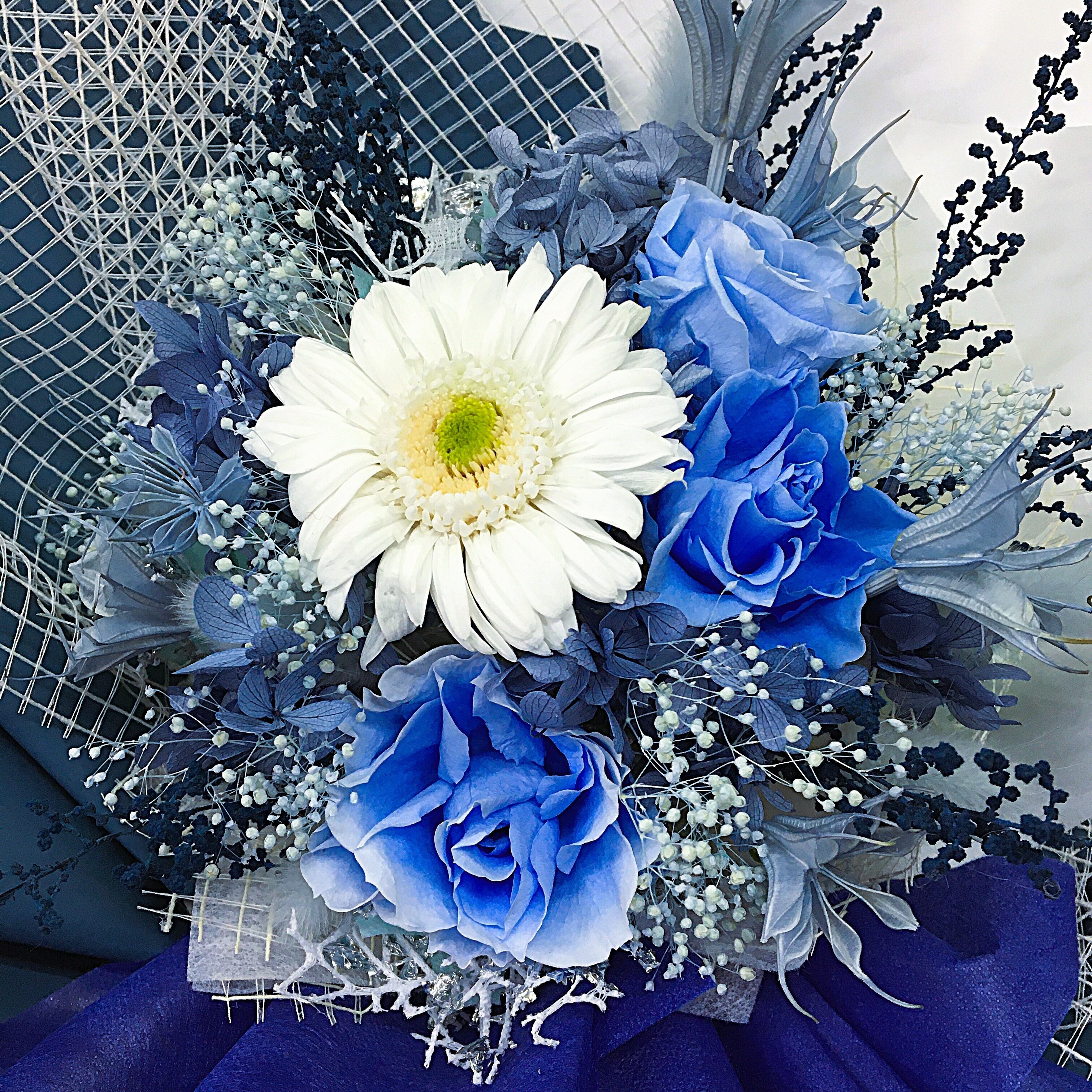 置けるブーケ(ブルー × ホワイト)B-051は、スタイリッシュなブルーと上品なホワイトの組み合わせが魅力のフラワーギフトです。この色合いは、男女問わずどんなシチュエーションでもおしゃれに演出し、贈り物としてだけでなく、自宅のインテリアにもぴったりのアイテムです。