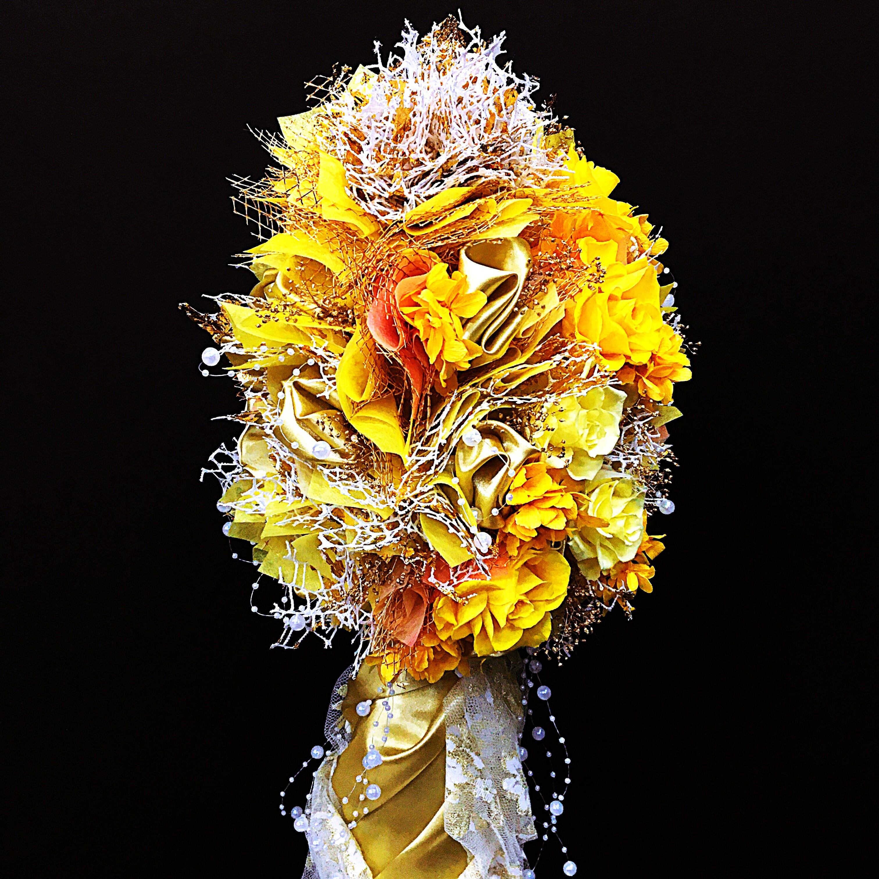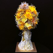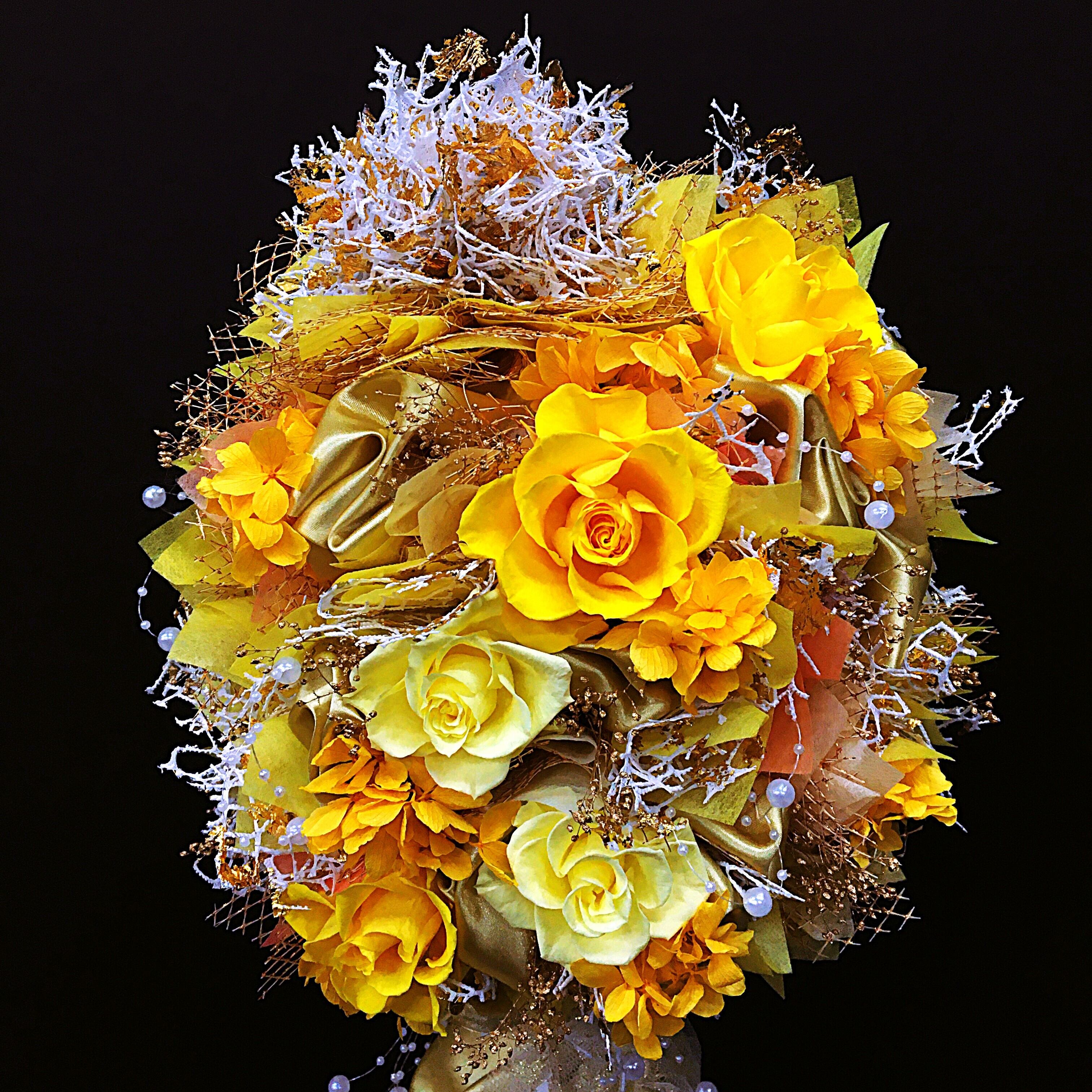 ・ビタミンカラーの明るいイエローのバラがメインとなり、煌びやかなゴールドの装飾が一層のエレガンスを加えたデザインです。