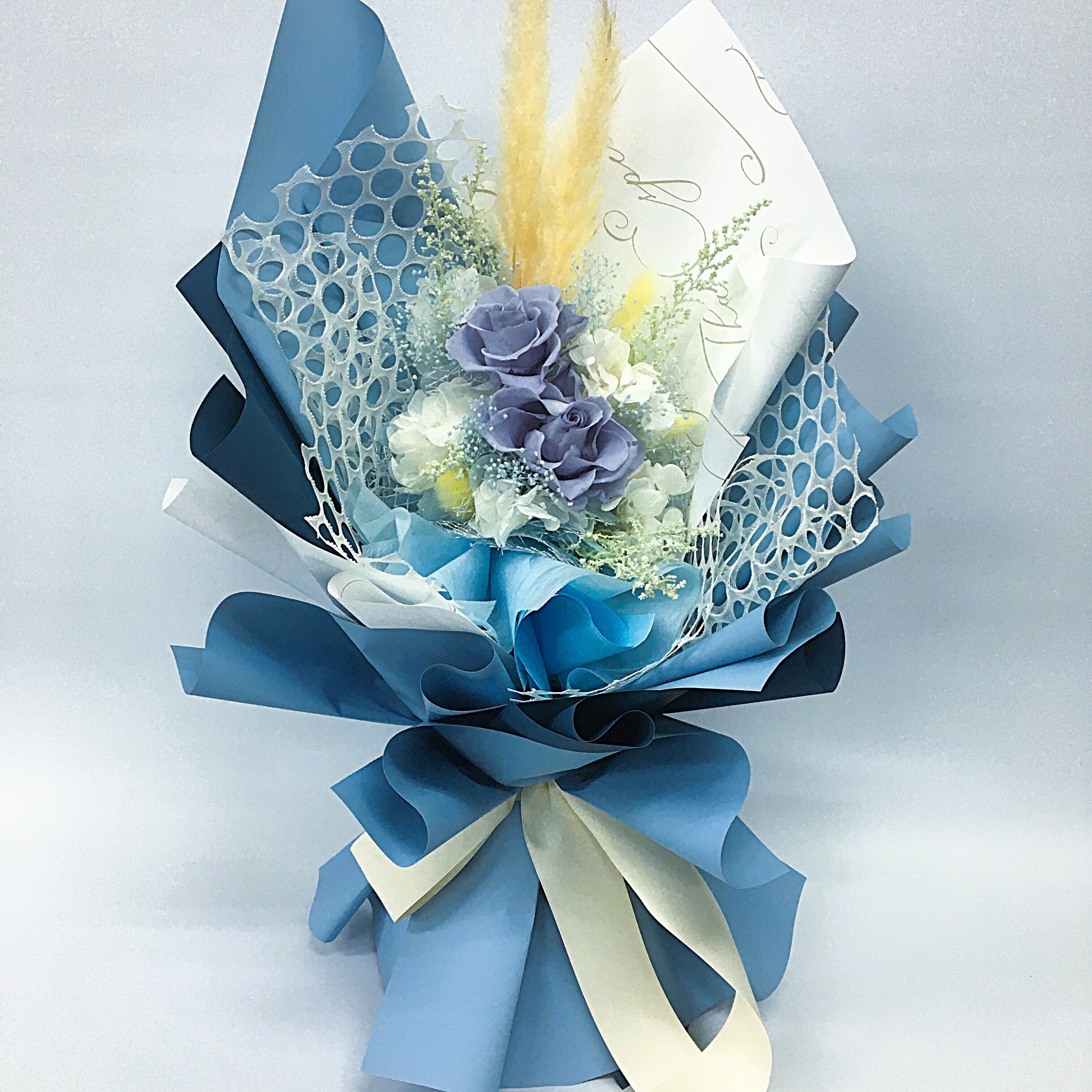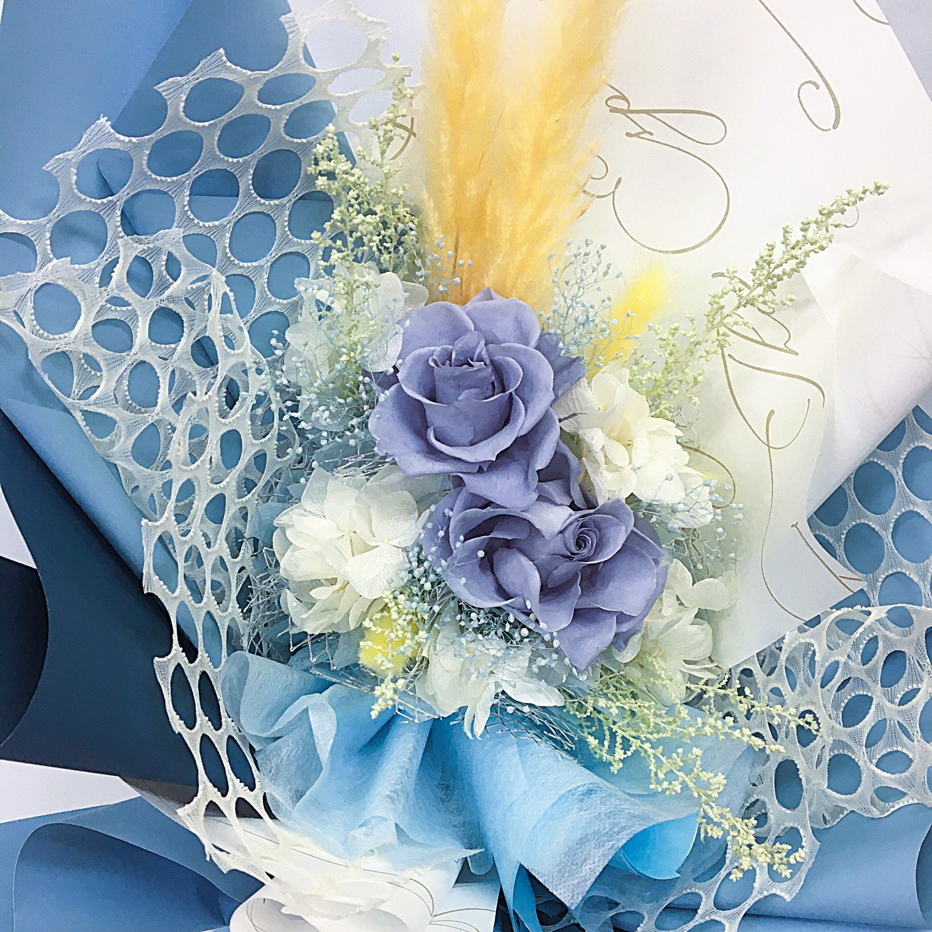 置けるブーケ(ライトブルー)B-056は、爽やかなライトブルーの花々が軽やかに組み合わさり、スタイリッシュな雰囲気を演出するフラワーギフトです。この品のあるデザインは、特別な贈り物としてだけでなく、あなたのお部屋のインテリアをおしゃれに彩るアイテムとしてもぴったりです。