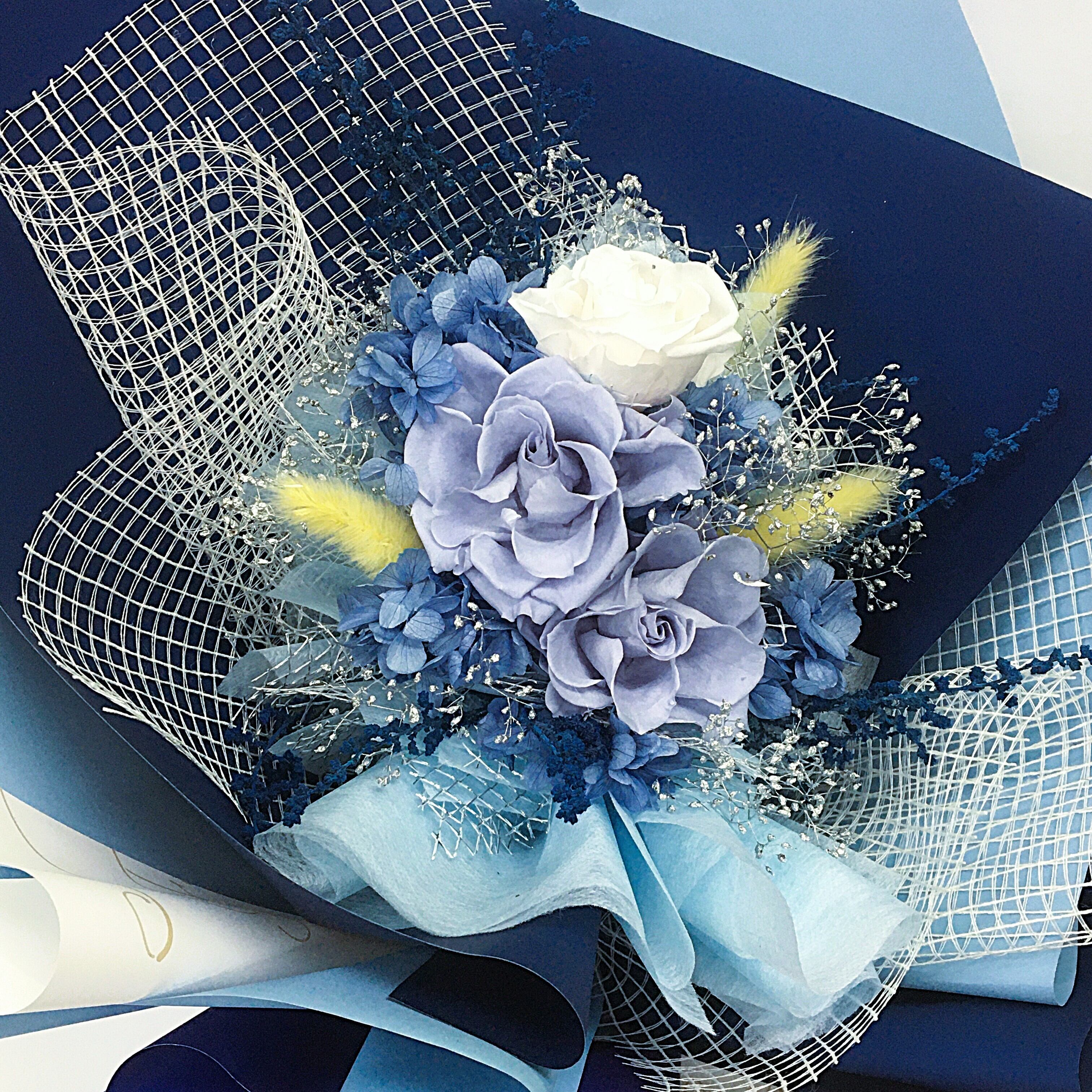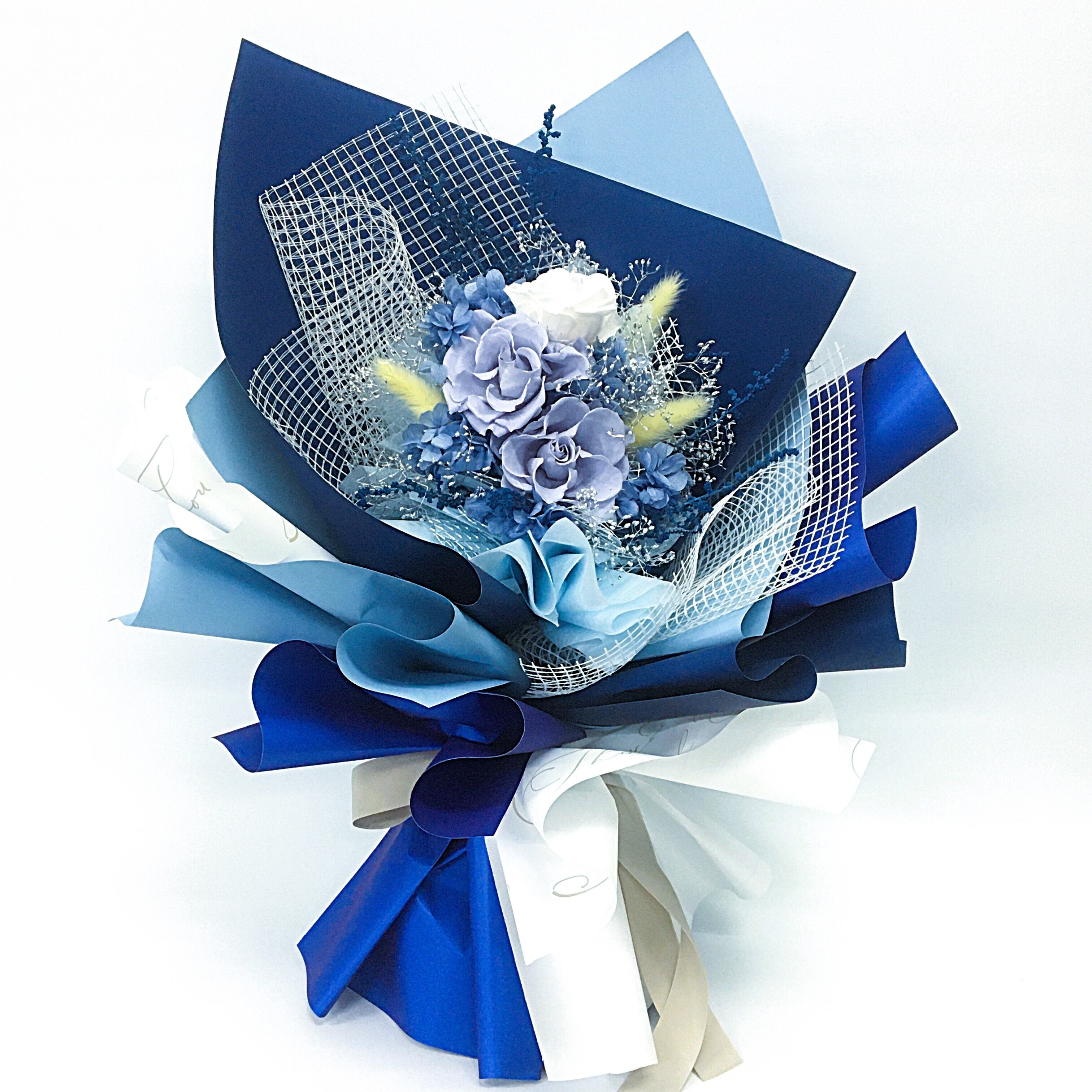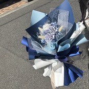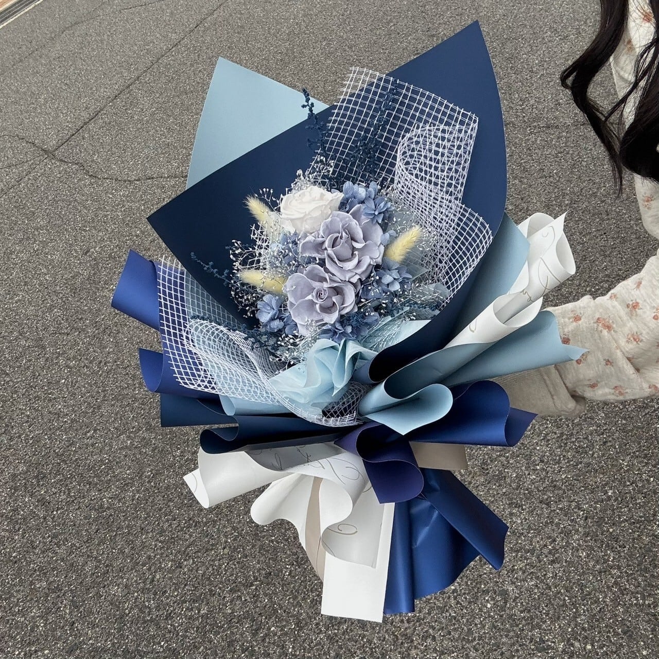 置けるブーケ(ダークブルー)B-057は、シックなダークブルーのラッピングが洗練された雰囲気を醸し出す、高級感溢れるフラワーギフトです。この上品なデザインは、特別な贈り物としてだけでなく、ご自宅のインテリアをスタイリッシュに彩るアイテムとしても最適です。