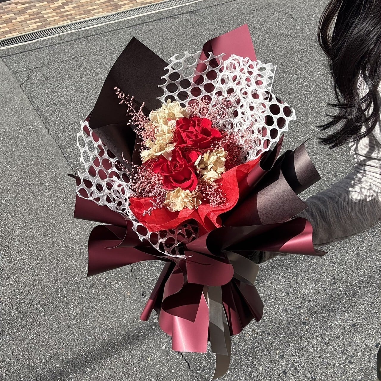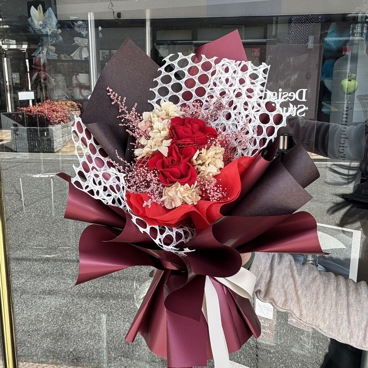 置けるブーケ(レッド)B-058は、高級感のある美しいレッドのバラが美しくラッピングされた、エレガントなフラワーギフトです。この特別なデザインは、プレゼントとしてはもちろん、ご自宅のインテリアを華やかに彩るアイテムとしてもぴったりです。