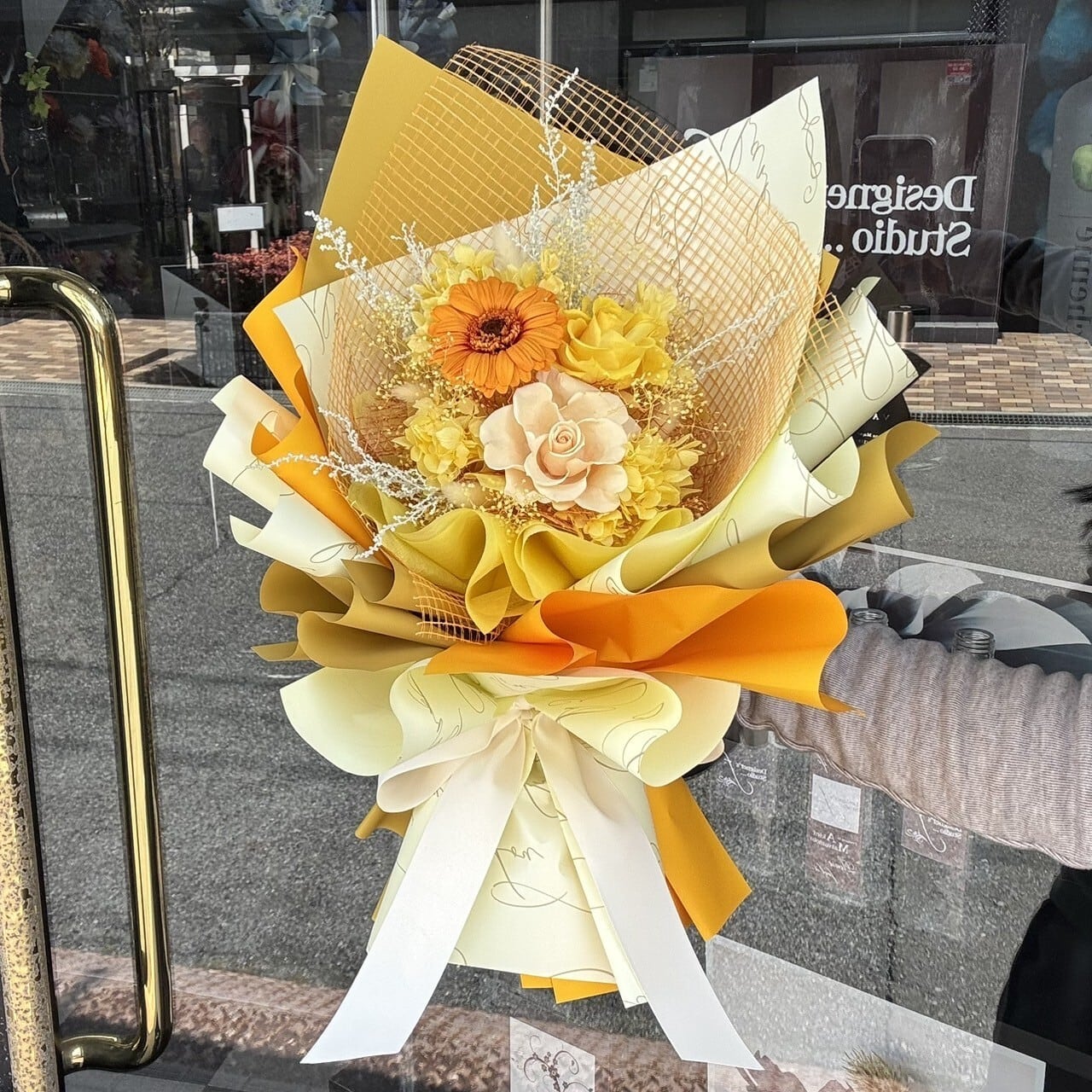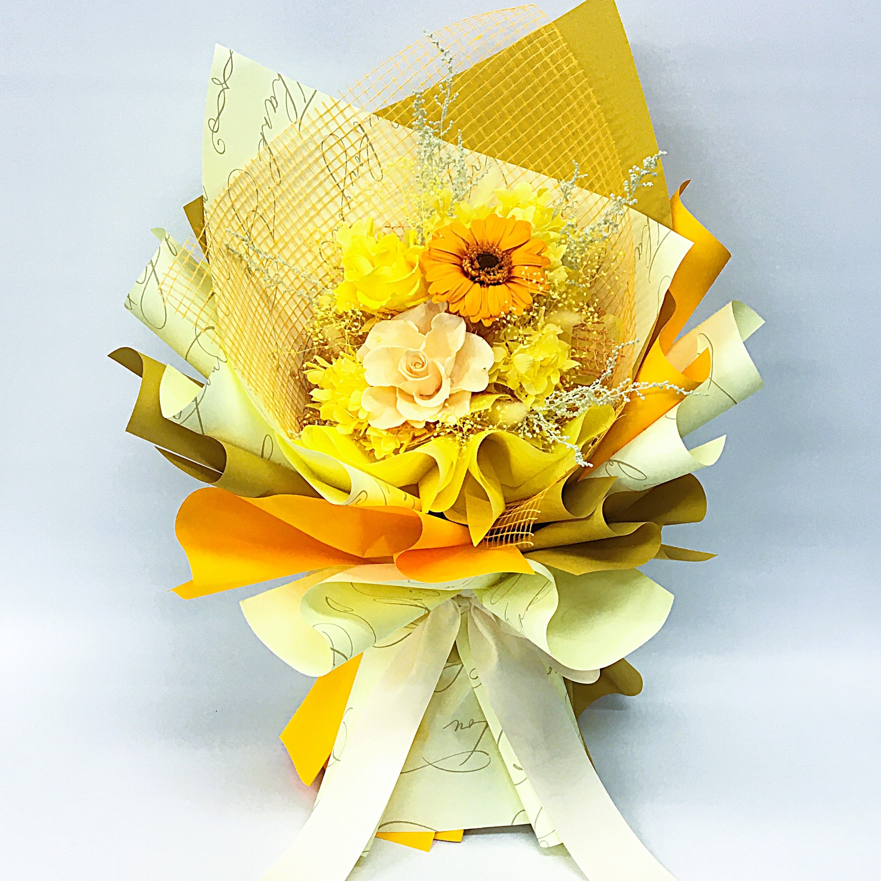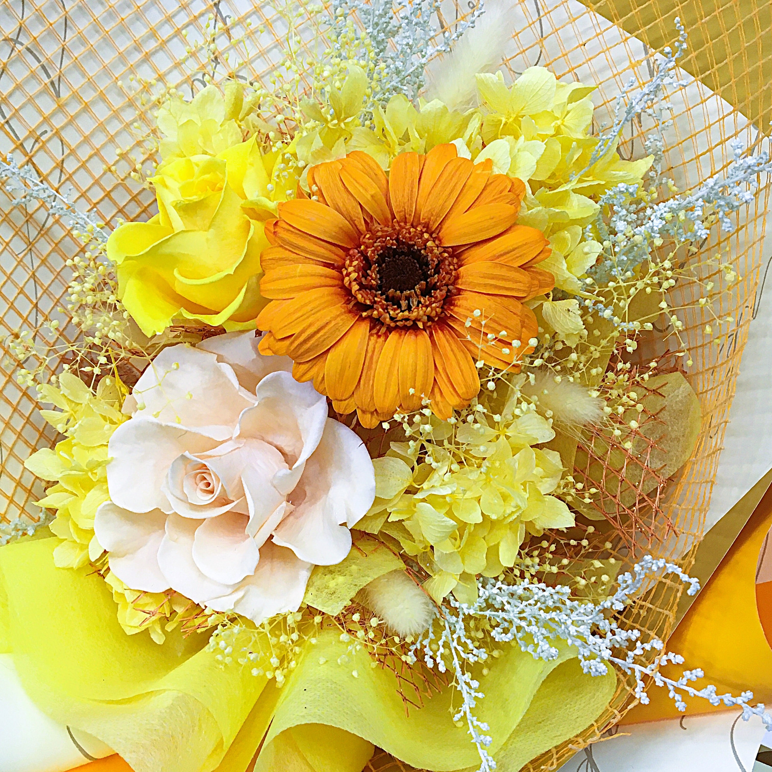 置けるブーケ(ソフトイエロー)B-059は、明るいオレンジのガーベラが華やかに彩られ、気持ちを明るくしてくれる魅力的なフラワーギフトです。このスタイリッシュなデザインは、特別な贈り物としてはもちろん、ご自宅のインテリアをやさしく照らすアイテムとしても最適です。