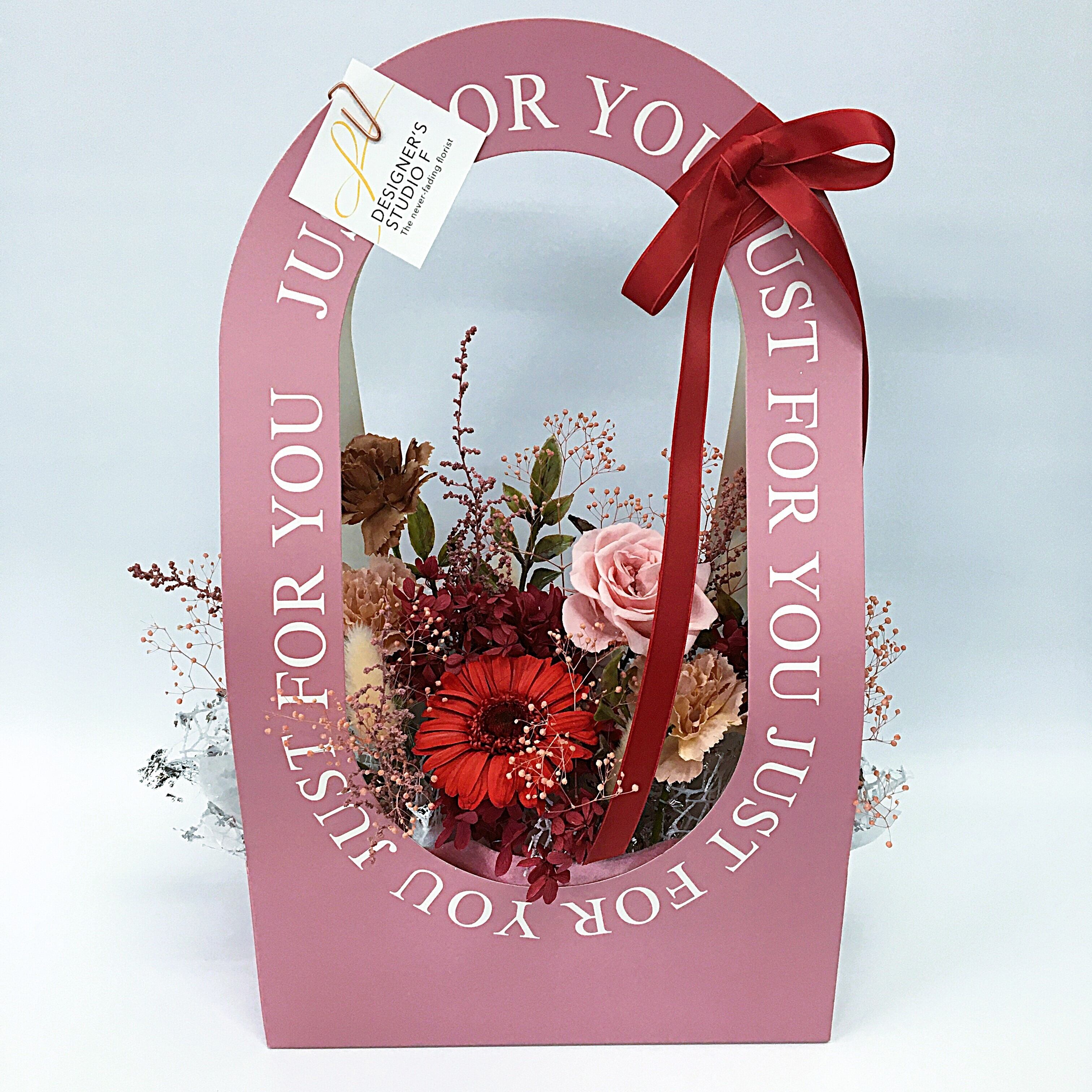 ・メインのガーベラ・バラなどはプリザーブドフラワーですが、その他一部造花を使用している部分がございます。