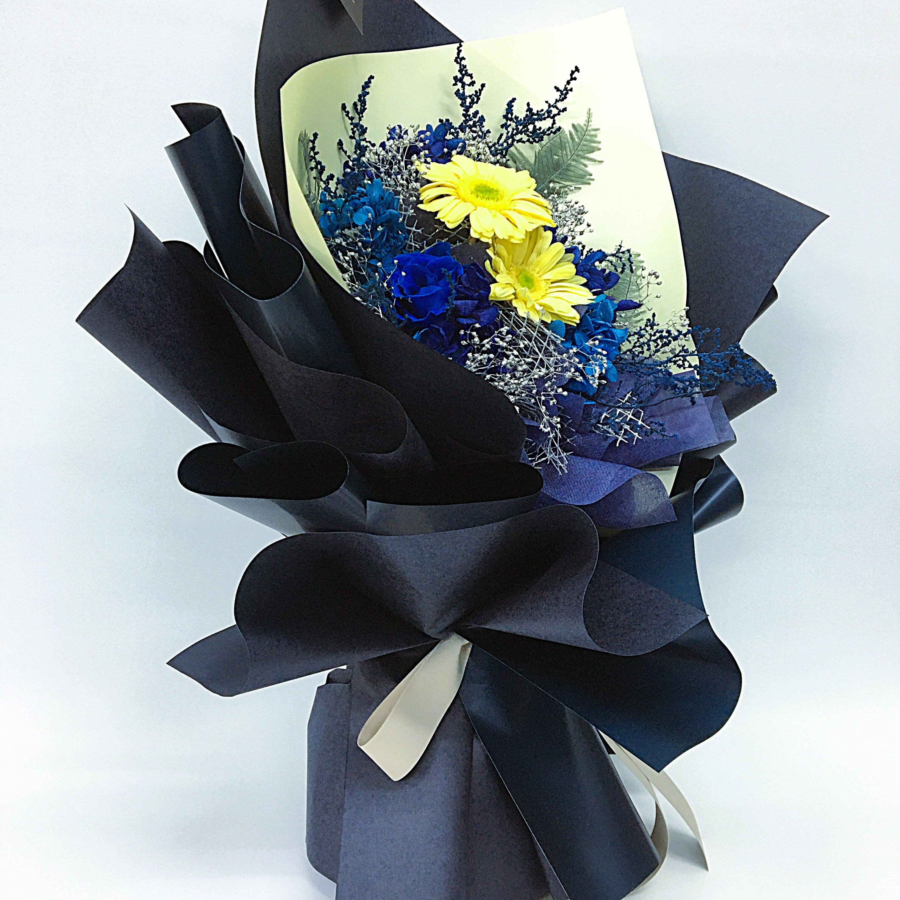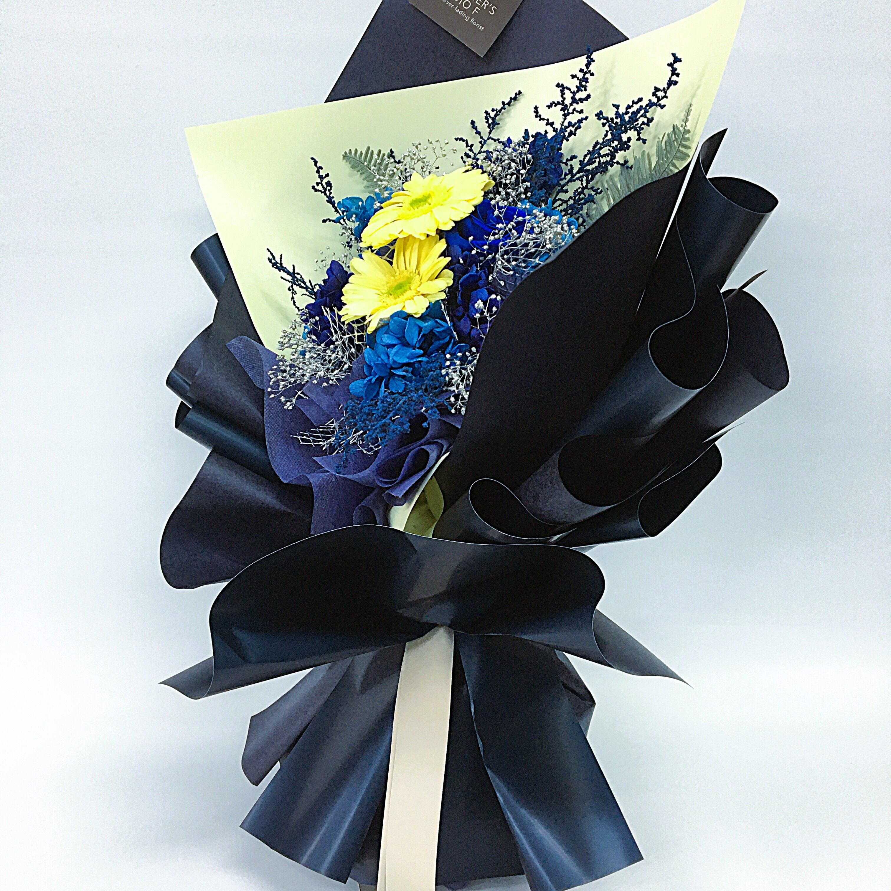 置けるブーケ(ネイビー×ソフトイエロー)B-063は、シックなネイビーのラッピングがお洒落な印象を与える、都会的なデザインのフラワーギフトです。この上品なブーケは、特別な日のプレゼントや日常のインテリアに最適です。