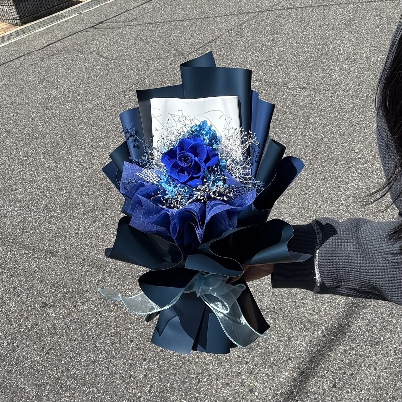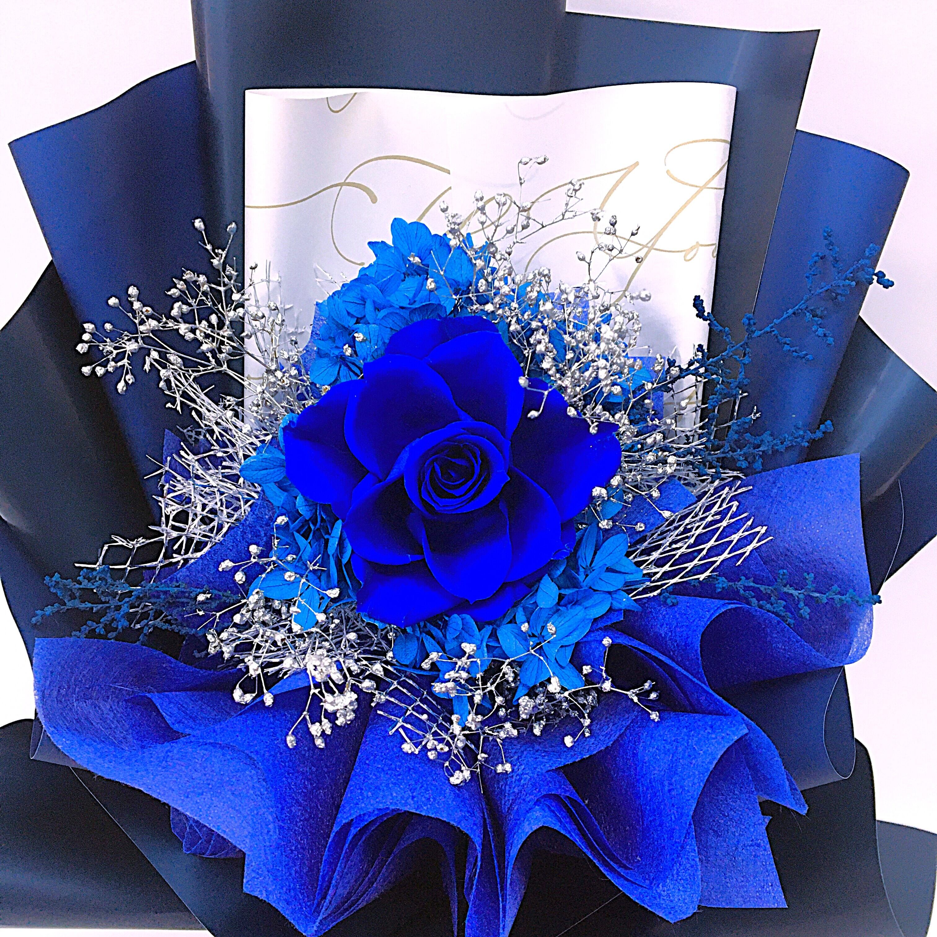 ・クールな青いバラとスタイリッシュなラッピングは男性女性問わず喜ばれる一品です。